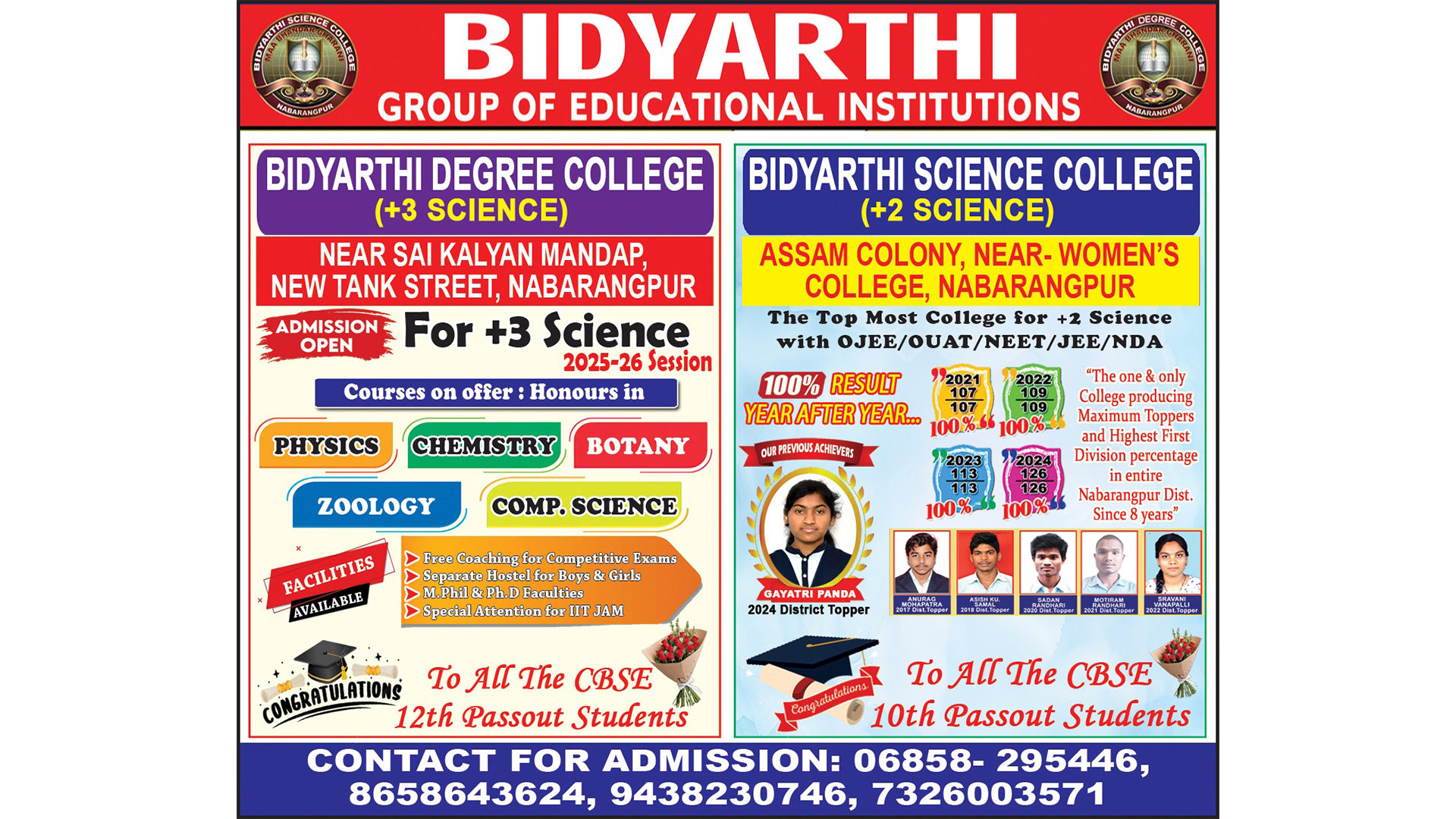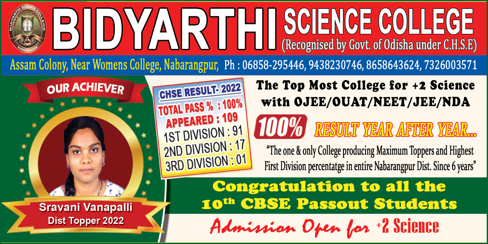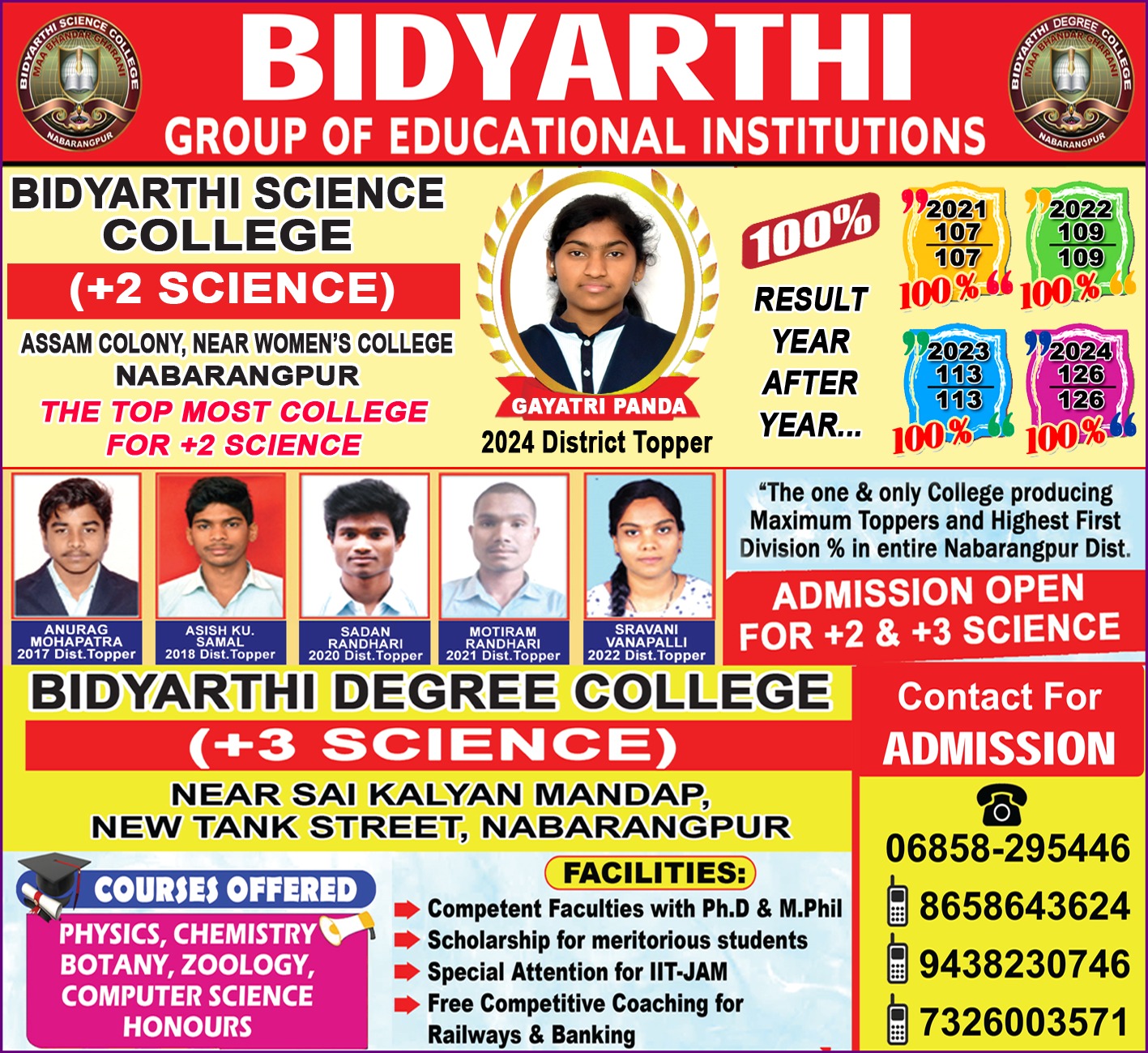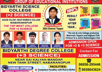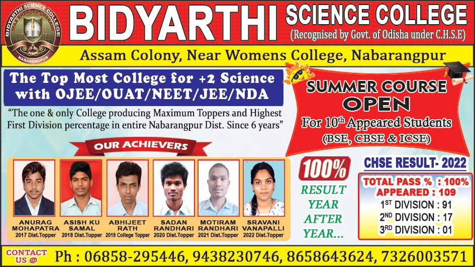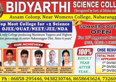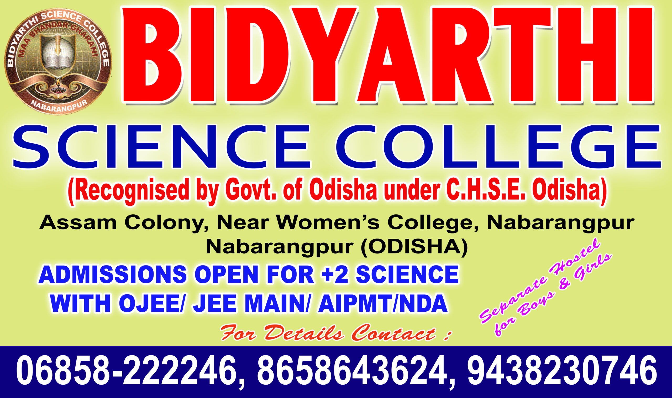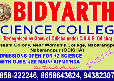Bidyarthi Science College is one of the best +2 Science college of Nabarangpur, providing day-cum-residential facility for the students. The college is located very near to the Nabarangpur Bus Stand, and the location is Maitree Vihar, Assam Colony, Nabarangpur, Odisha – 764059. Phone: 094382 30746